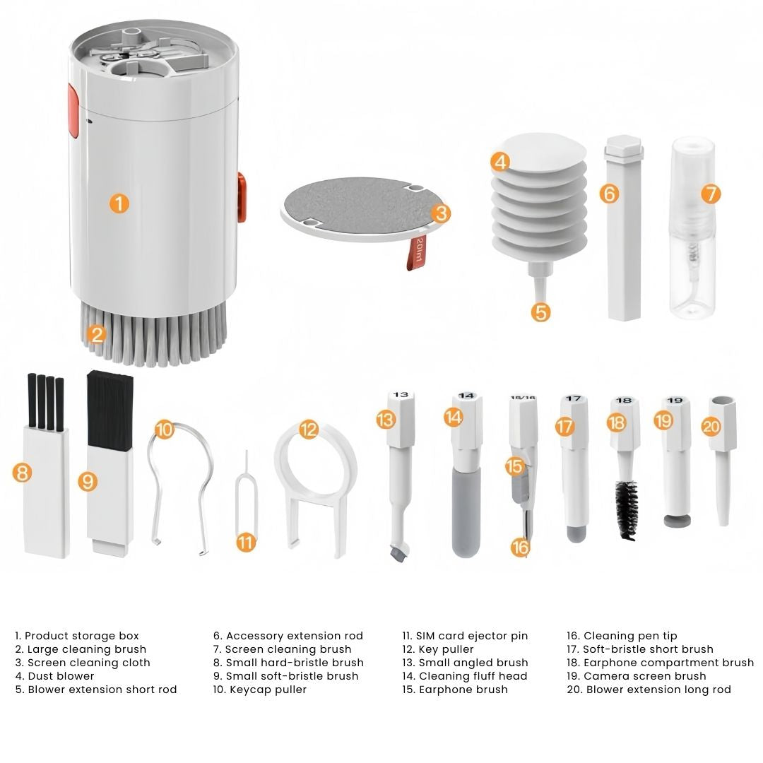 Introducing our Super Electronic Cleaner Kit 20-IN-1 – the ultimate solution for keeping your electronic devices spotlessly clean and functioning at their best. Perfect for everyone from tech enthusiasts to photographers, this comprehensive kit is designed to address every aspect of gadget cleanliness. Whether it's for office, home, or on-the-go use, this kit is a must-have for maintaining the pristine condition of your beloved electronics.